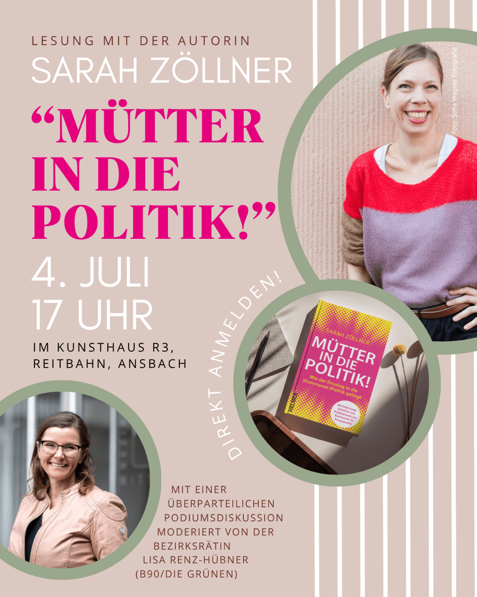 Am Freitag, 4. Juli 2025 um 17:00 Uhr findet die Veranstaltung im Kunsthaus R3 in Ansbach statt. Die Politikwissenschaftlerin und Autorin Sarah Zöllner liest aus ihrem Buch „Mütter in die Politik!“ – und zeigt darin, wie Frauen trotz familiärer Verantwortung politisch aktiv werden können.