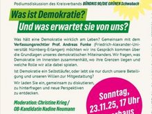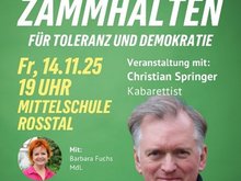 14.11.25 - Weitere Infos: https://www.gruene-fuerth-land.de/2025/10/30/zammhalten-fuer-toleranz-und-demokratie-mit-christian-springer/