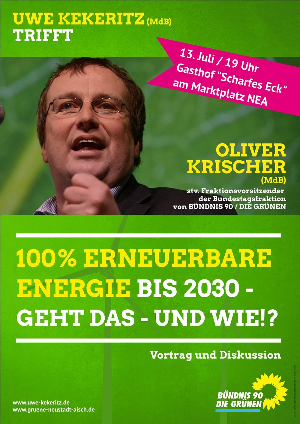 Einladung zur Veranstaltung in Neustadt/Aisch mit Oliver Krischer und Uwe Kekeritz am Donnerstag, 13.07.2017  zum Thema: "100 % erneuerbare Energie bis 2030 geht das- und wie!?"