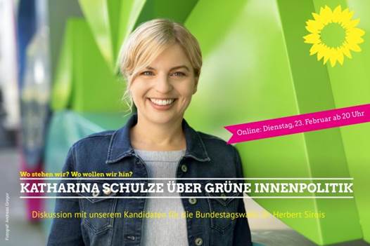 Vortrag und Diskussion zur Grünen Innenpolitik mit Katharina Schulze MdL,Fraktionsvorsitzende und Innenpolitische Sprecherin und mit Dr. Herbert Sirois, Bundestagskandidat