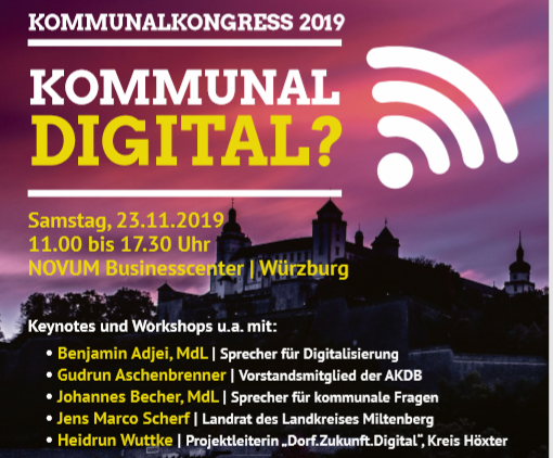 Am 23.11. findet in Würzburg der Kommunalkongress der Landtagsfraktion 2019 „Kommunal Digital" statt. Das Thema der Digitalisierung wird in den Kommunen die nächsten Jahre sehr präsent sein und somit ist das doch eine gute Chance, sich intensiv mit der Materie auseinander zu setzen und gegenseitig ins Gespräch zu kommen.