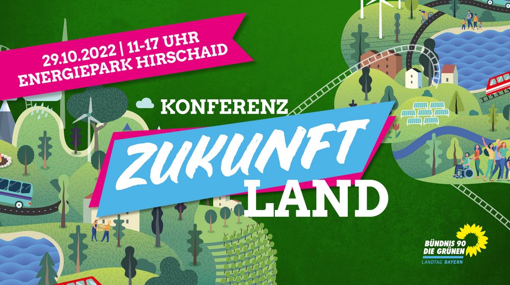 die Fraktion Bündnis 90/Die Grünen im Bayerischen Landtag, laden Sie herzlich ein zu unserer Konferenz „ZukunftLAND – Heimat ist, was wir draus machen!“ am 29. Oktober 2022 in Hirschaid. Wir möchten mit Ihnen über Ihre Ideen für Bayerns ländliche Räume sprechen und Ihre Vorschläge für unsere Arbeit im Bayerischen Landtag mitnehmen. Denn wir wissen, innovative Ideen entstehen dort, wo der Pioniergeist zu Hause ist: auf dem Land! Herzstück der Konferenz sind Workshops zu den Themen “Gemeinschaft leben”, “Zuhause sein”, “Mobil sein”, “Gesund bleiben”, “Energiewende gestalten“, “Lokal genießen” und “Gute Bildung”. Gemeinsam mit Ihnen wollen wir diskutieren, wie wir zusammen eine gute Zukunft auf dem Land gestalten können und welche politischen Rahmenbedingungen es dafür braucht. Nach einer kurzen Begrüßung durch den Fraktionsvorsitz wird uns Kabarettistin Franziska Wanninger mit einer musikalischen Lesung auf das Thema einstimmen. Anschließend gibt es eine Keynote von Manuela Rottmann, parlamentarische Staatssekretärin im Bundesministerium für Ernährung und Landwirtschaft. Für einen beschwingten Ausklang bei Speis und Trank sorgt die Band Bavaschôro.
