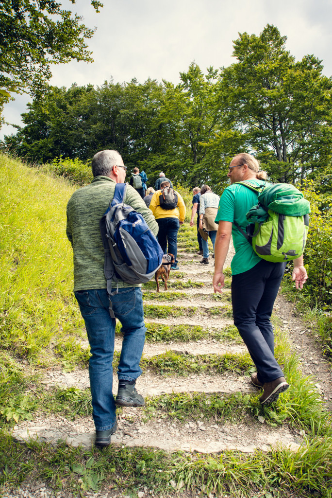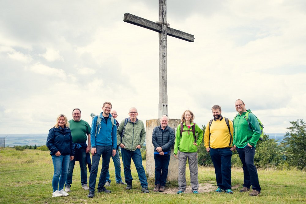 Beim einstündigen Aufstieg vom Wanderparkplatz bei Wittelshofen hoch zum Gipfelkreuz ging das Gespräch auch um lokale Projekte für eine nachhaltige Mobilität. Seit mehr als zwei Jahrzehnten setzen sich Engagierte und Kommunalpolitiker*innen für die Reaktivierung der Bahnstrecken der Hesselbergbahn von Gunzenhausen nach Nördlingen und der Schiene von Dombühl nach Nördlingen ein.
