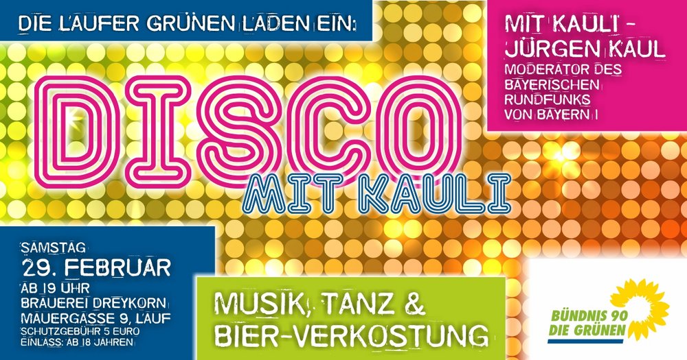 *Disco in Lauf - **Kauli legt auf. Coole Location: Braurei Dreykorn.* *Jürgen Kaul*, *Moderator von Bayern 1*, Bayerischer Rundfunk Musik, Tanz, Bierverkostung & mehr *Jetzt - Diesen Samstag, 29. Februar ab 19 Uhr** *Lauf, Mauergasse 9 Wo gibt es Karten? * einfach per eMail: bb@bisping.de * Am Infostand der Grünen, Samstag vormittags, Marktplatz-Fußgänger-Zone * Grand Optik, Schlossplatz 2 * Gasthof Weißes Lamm, Marktplatz 19 * BeChic, Lieblingsteile, Simonshofer Straße 5 * eBike Maass, Barthstraße 1 * Donnerstag, 27.02.: Bürgerdialog in Schönberg, Rotes Ross, 19:30 Uhr * Am Infostand der Grünen, Samstag vormittag, Marktplatz-Fußgänger-Zone und Lauf links, Röthenbacher Str., ggüber Norma/DM * sowie dann an der Abendkasse vor Ort Schutzgebühr: 5 Euro, Einlass ab 18 Jahren