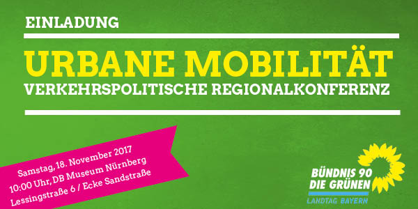 Programm 10:00 Uhr Einlass 10:30 Uhr Begrüßung und Einführung: Markus Ganserer, MdL 10:45 Uhr Benedikt Bisping, 1. Bürgermeister Stadt Lauf a. d. Pegnitz Gut unterwegs durch ein wachsendes und vertaktetes ÖPNV-Netz 11:30 Uhr Thiemo Graf, 3. Bürgermeister Stadt Röthenbach a. d. Pegnitz Umstieg auf’s Rad: Motivierende Radverkehrsinfrastruktur 12:15 Uhr Mittagspause im Foyer 13:00 Uhr Barbara Metz, stv. Bundesgeschäftsführerin Deutsche Umwelthilfe e.V. Recht auf saubere Luft 13:45 Uhr Winfried Hermann, Verkehrsminister Baden-Württemberg Nachhaltige Mobilität - Verkehrspolitik in Baden-Württemberg 14:45 Uhr Kaffeepause im Foyer 15:00 Uhr Prof. Dr.-Ing. Harald Kipke, TH Nürnberg, Leiter Labor für Verkehrswesen Parken in der Stadt - ein unterschätztes Problem mit großer Wirkung 15:45 Uhr Matthias Vondran, Scouter Carsharing Nürnberg/Fürth Mit Carsharing autofrei leben 16:30 Uhr Fazit und Ausblick: Markus Ganserer, MdL Kontakt und Anmeldung: Bitte schicken Sie Ihre Anmeldung bis spätestens 10. November 2017 an: harald.fuchs@gruene-fraktion-bayern.de Herzliche Grüße Markus Ganserer, MdL Sprecher für Mobilität |