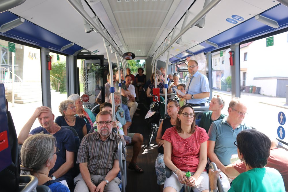 „Bitte einsteigen“ hieß es für die Fahrgäste der „Grüne Wege“-Bustour des Kreisverbands Schwabach, die sich von Stadtverkehrs-Leiter Tobias Mayr an 21 Haltestellen zeigen ließen, wo Erfolge und Verbesserungen im Öffentlichen Personennahverkehr (ÖPNV) in Schwabach deutlich zu sehen sind und welche äußeren Hemmnisse den ÖPNV an mancher Stelle noch ausbremsen. Nach jedem Kurzbericht an den Stationen folge eine rege Diskussion der Teilnehmer auf hohem fachlichen Niveau.
