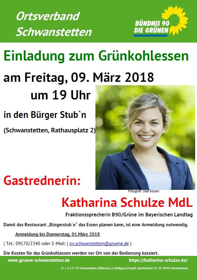 Wer gerne mal Grünkohlessen möchte und mit uns und unserer Fraktionssprecherin Katharina Schulze, der ist herzlich eingeladen. Der OV Schwanstetten bittet um Anmeldung bis Donnerstag 01.03.2018