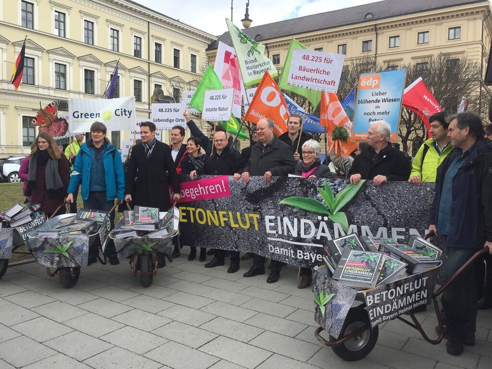 Die erste Hürde zum Volksbegehren ist genommen: 48.225 Unterschriften wurden am Mittwoch vom Bündnis „Betonflut eindämmen" an das Innenministerium übergeben. So viele, wie bei keinem anderen Volksbegehren in der jüngsten bayerischen Geschichte. Mit ihren Fahnen und Transparenten stellten sich die Aktiven der vielen Unterstützerverbände symbolisch einem Bagger vor dem Innenministerium entgegen, um die bayerische Heimat zu schützen.